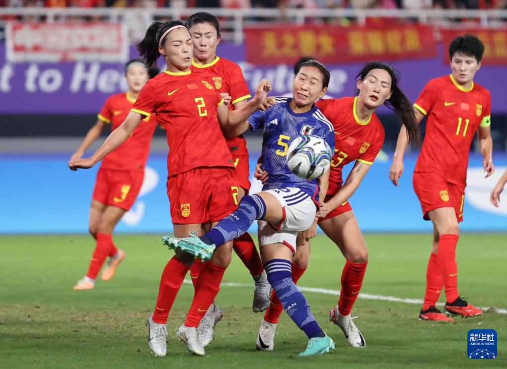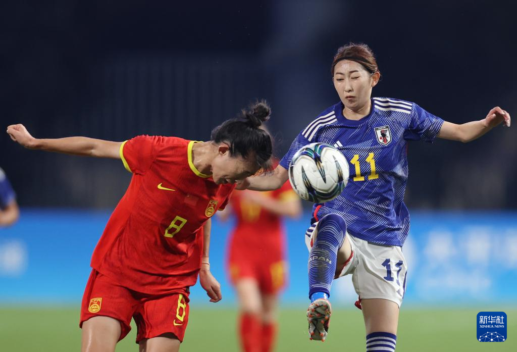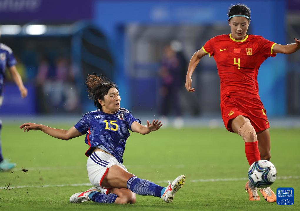 3日、準決勝でボールを競り合う脇阪麗奈(中央)。(杭州=新華社記者/賈浩成)pagebreak