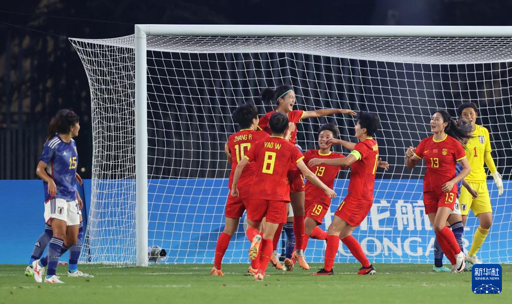 3日、準決勝でゴールを決め、チームメイトと喜ぶ汪琳琳(おう・りんりん、左から2人目)。(杭州=新華社記者/賈浩成)pagebreak
