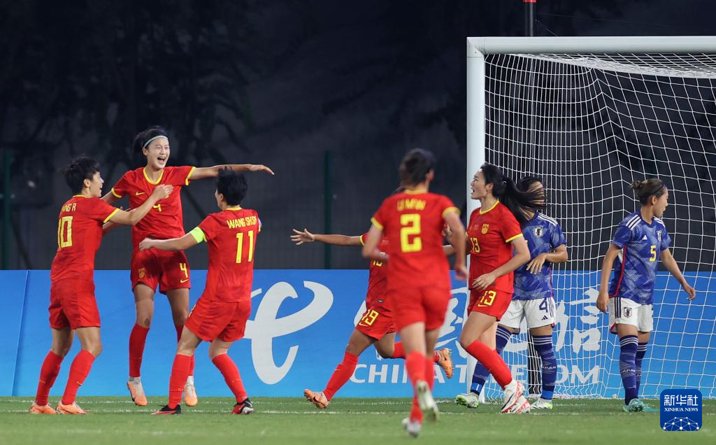 3日、準決勝でゴールが決まり、喜ぶ中国選手。(杭州=新華社記者/張晨)