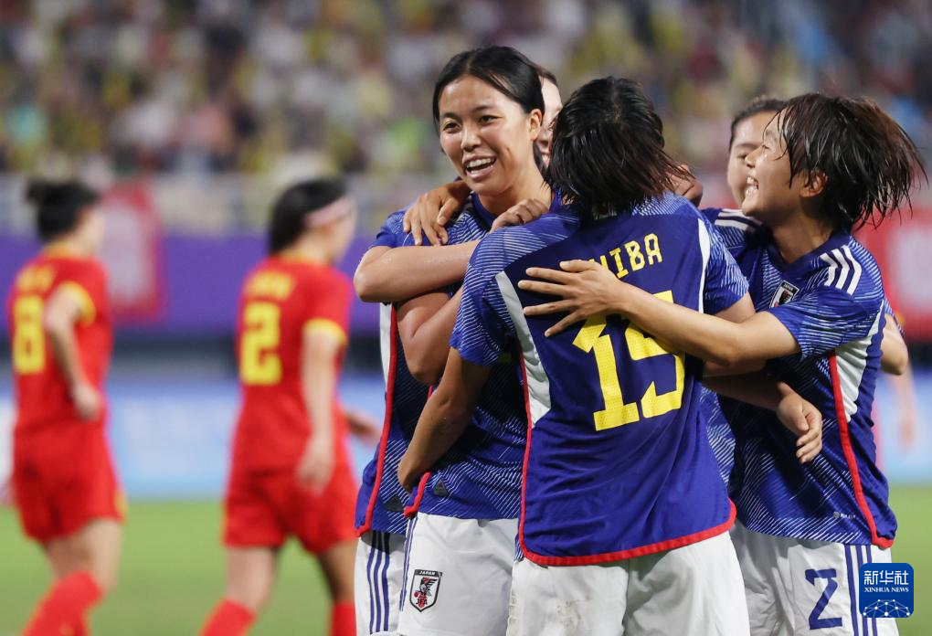 3日、準決勝でゴールを決め、チームメイトと抱き合う谷川萌々子(左端)。(杭州=新華社記者/賈浩成)pagebreak