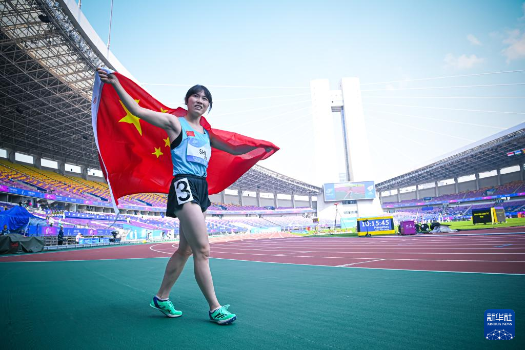 23日、中国の国旗を背に金メダルを喜ぶ史逸婷。(杭州=新華社記者/江漢)
