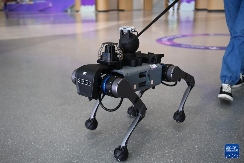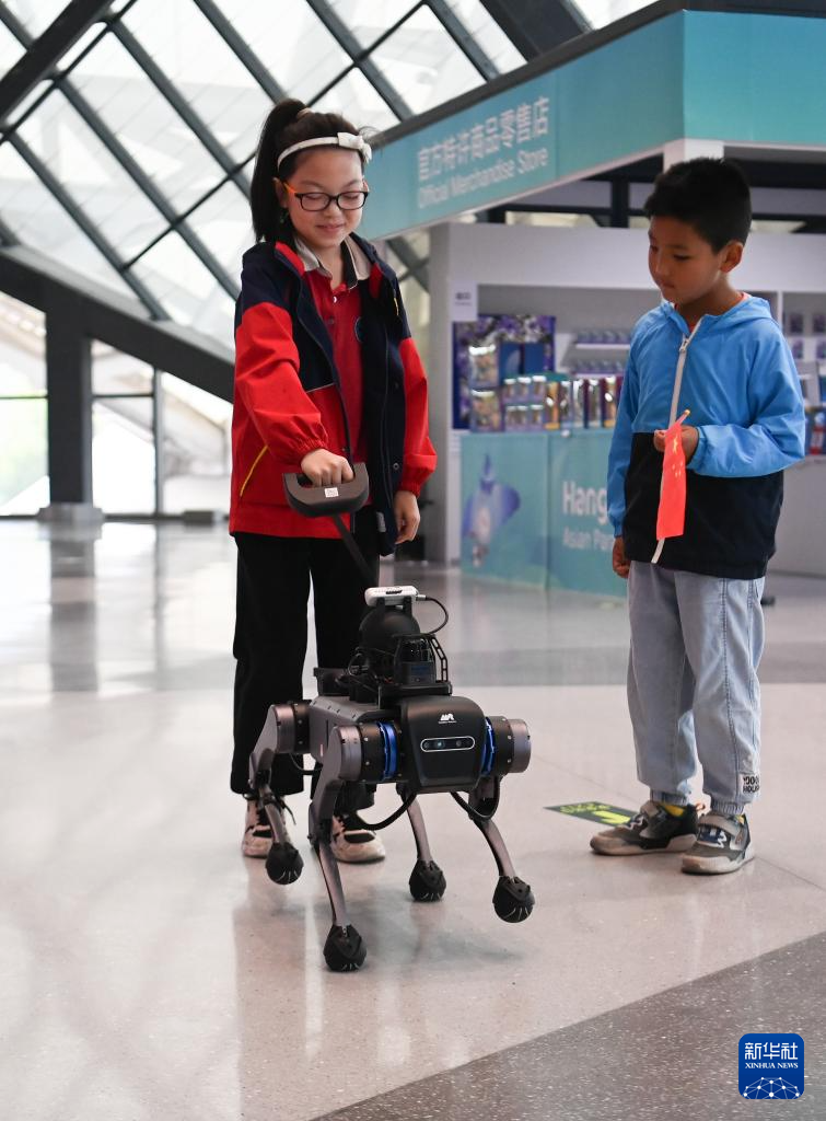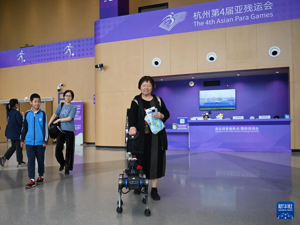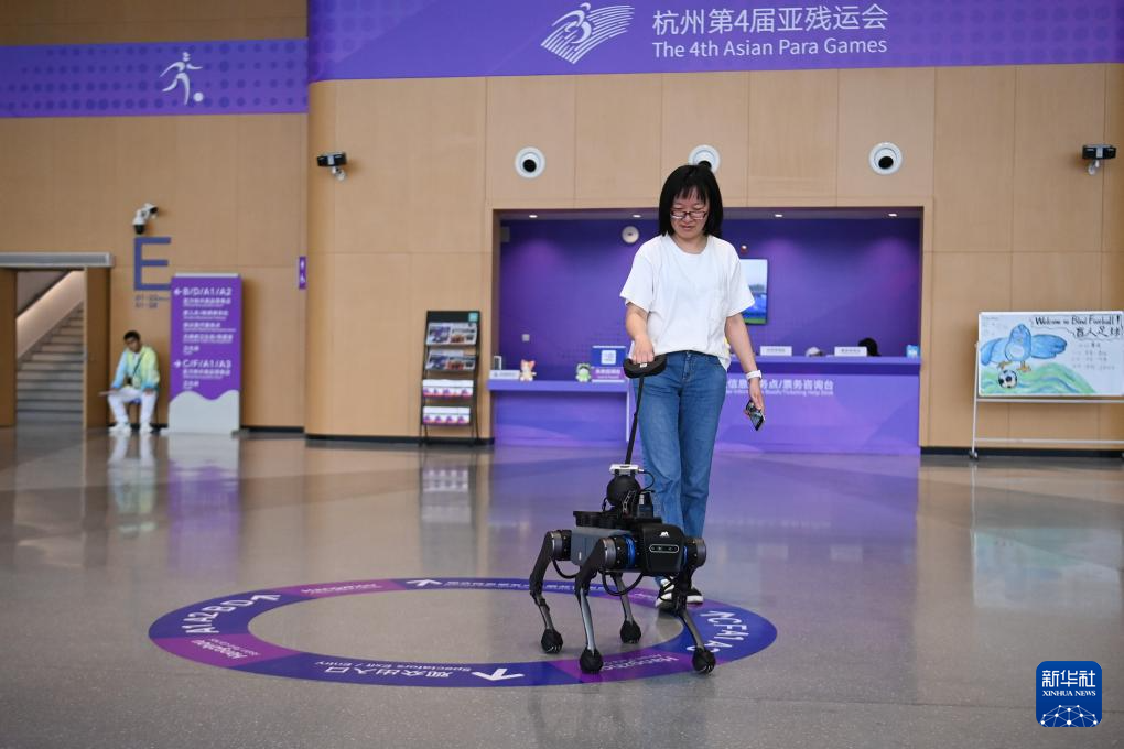 【新華社杭州10月28日】第4回アジアパラ競技大会(杭州アジアパラ)の期間中、視覚障害者によるブラインドサッカーの競技会場で盲導犬ロボット「小西」が活躍している。浙江省杭州市の西湖大学が開発。競技会場の拱墅(きょうしょ)運河スポーツ公園体育場の地図を把握しており、中国語と英語の指示を理解して、最適なルートで視覚障害者を案内する。利用者はリードに取り付けられたセンサーを通じて歩行速度を調節することもできるという。