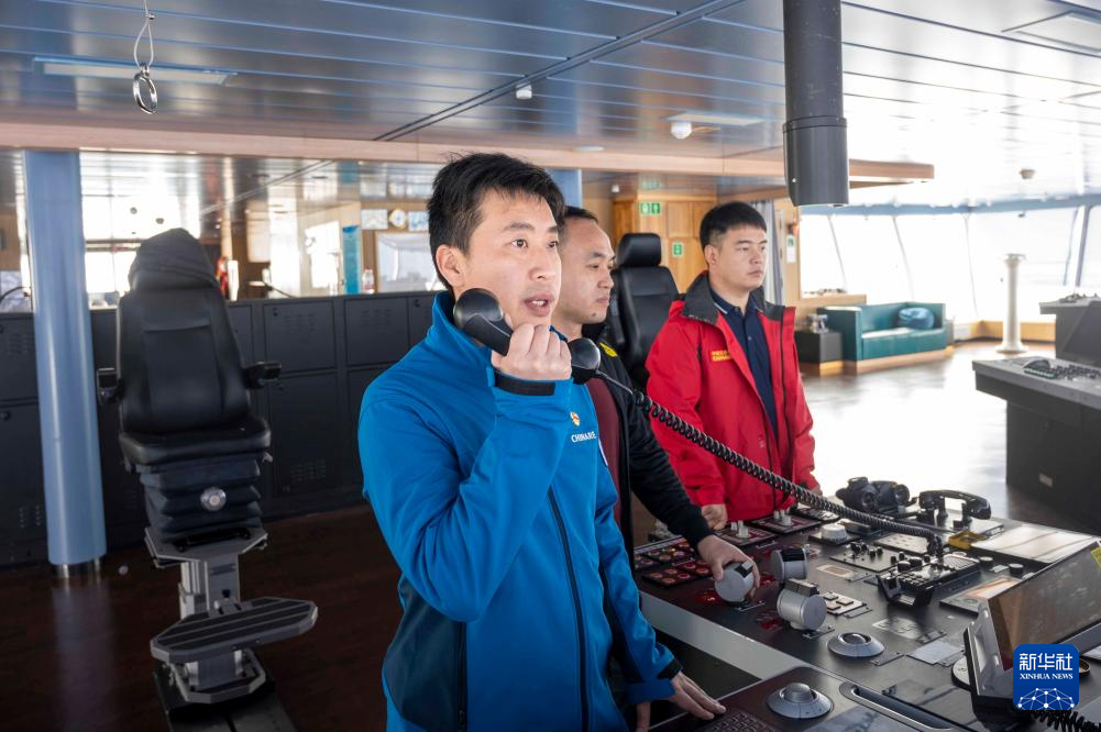 11月30日、砕氷や先導の状況について「天恵」と連絡を取る「雪竜2号」の肖志民(しょう・しみん)船長(左)。(雪竜2号=新華社記者/周円)