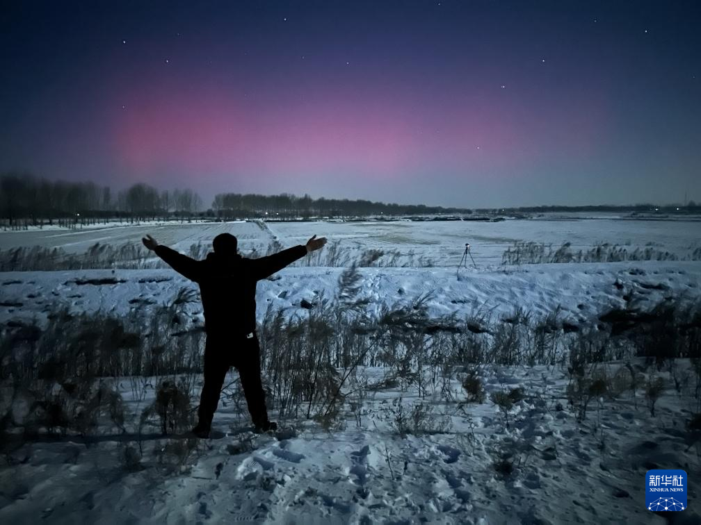 1日夜、黒竜江省佳木斯市で、オーロラをバックに記念撮影する写真愛好家。(ジャムス=新華社配信/曲玉宝)