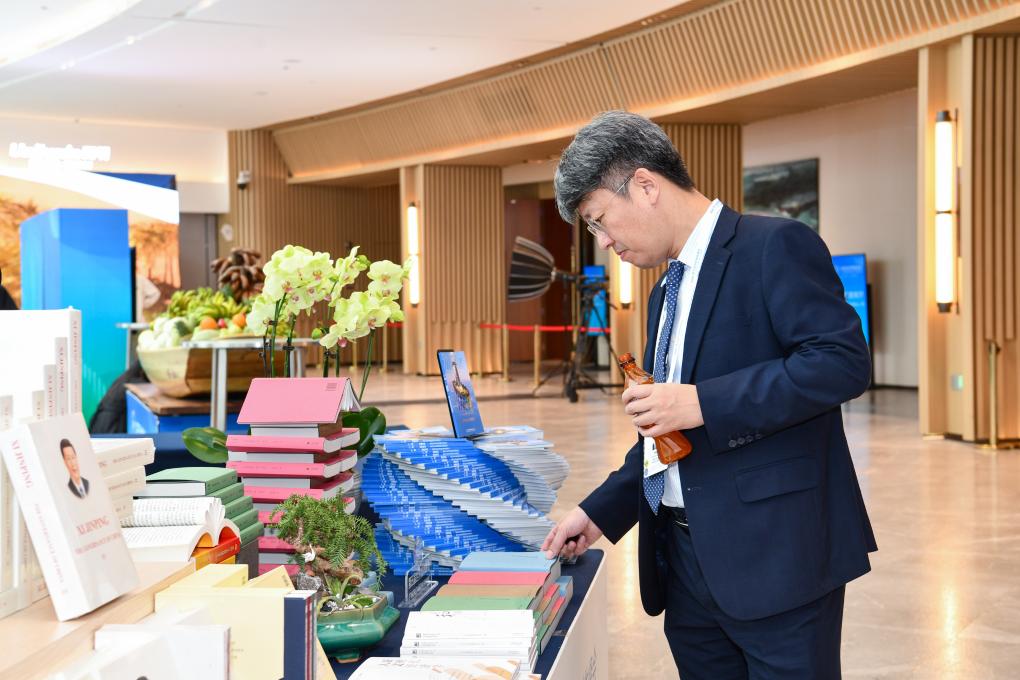 2日、広州市の南沙湾浜海会議センターで書籍を手に取るサミット出席者。(広州=新華社記者/梁旭)