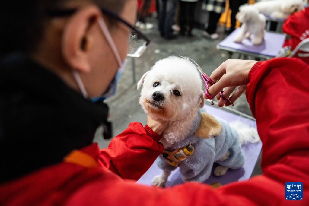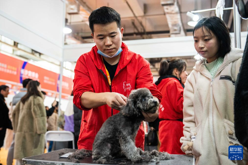 2日、長沙紅星国際会展中心で犬の毛並みを整える出展者。(長沙=新華社記者/陳思汗)