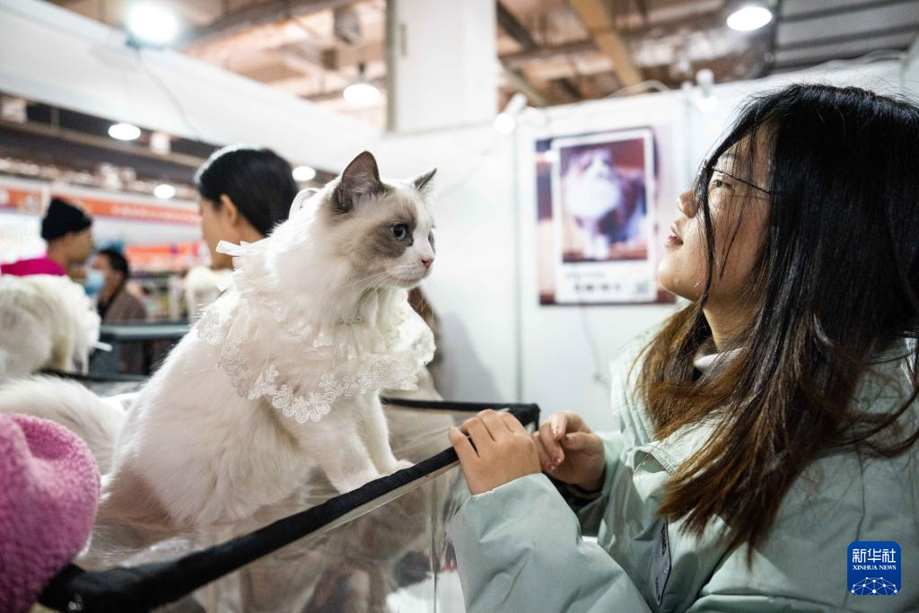 2日、長沙紅星国際会展中心で猫と触れ合う来場者。(長沙=新華社記者/陳思汗)pagebreak