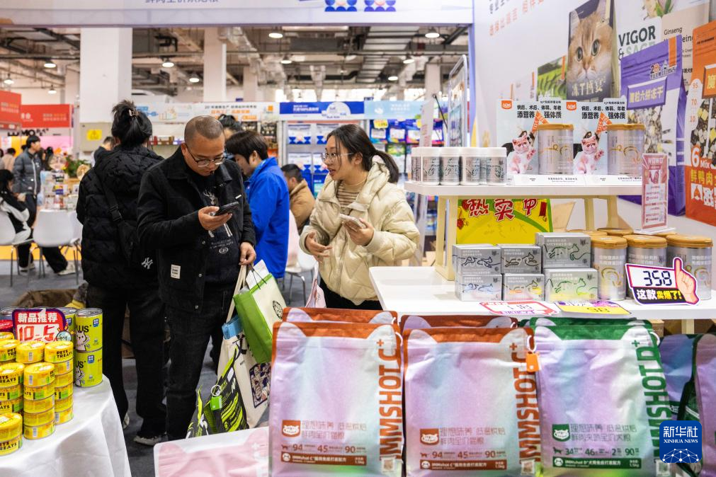 2日、長沙紅星国際会展中心でキャットフードをPRする出展者。(長沙=新華社記者/陳思汗)