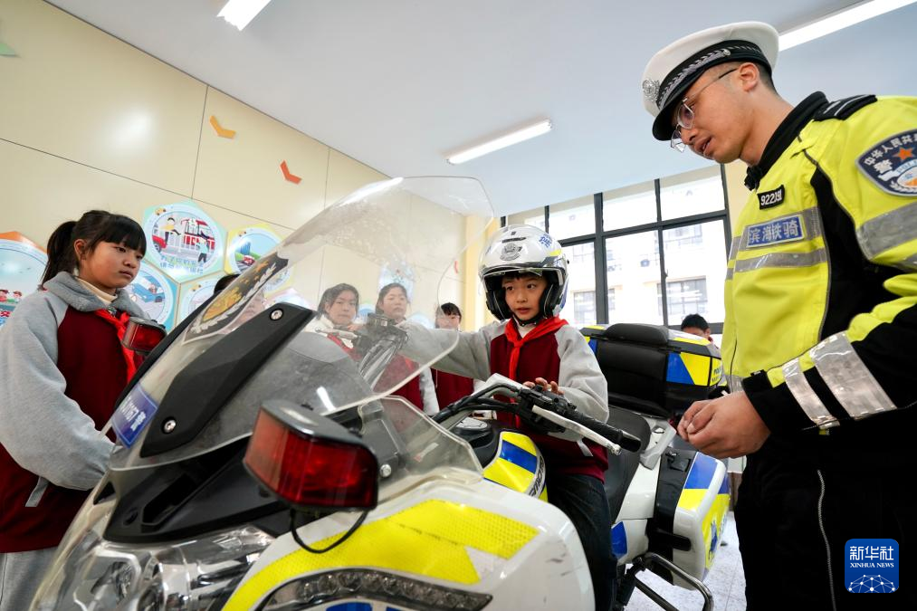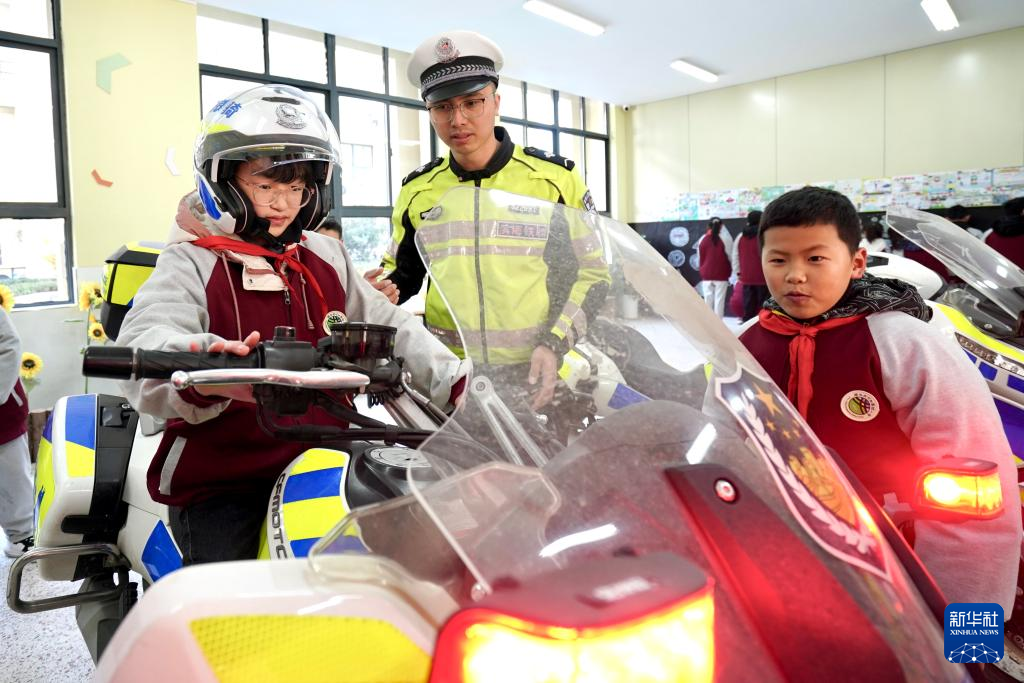 1日、塩城市浜海県の行知実験小学校で、白バイに試乗する児童。(塩城=新華社記者/李博)