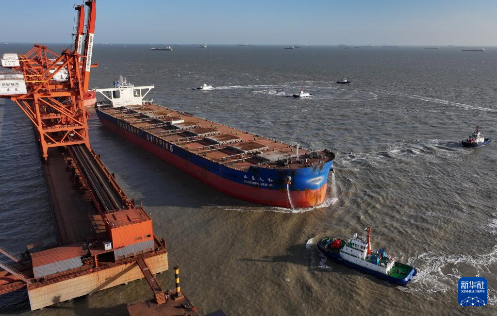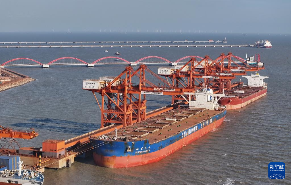 2023年12月26日、唐山港・曹妃甸港区の鉱石埠頭で荷降ろしする船舶。(小型無人機から、唐山=新華社記者/楊世尭)