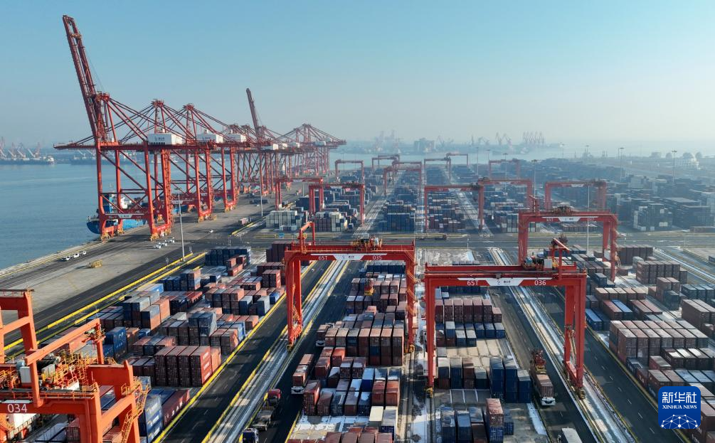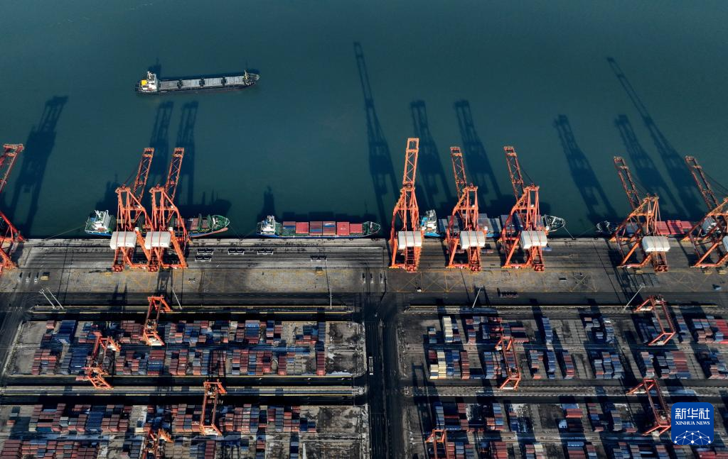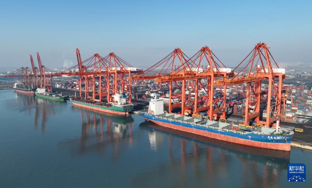 2023年12月28日、唐山港・京唐港区のコンテナ埠頭で荷降ろしする船舶。(小型無人機から、唐山=新華社記者/楊世尭)