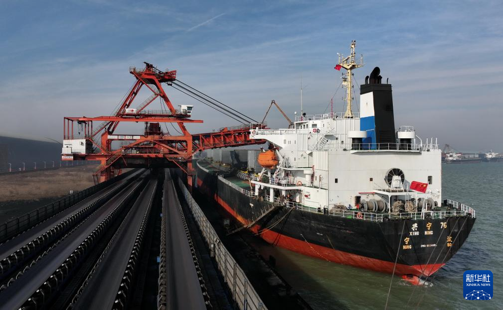 2023年12月26日、唐山港・曹妃甸港区の石炭埠頭で貨物を積み込む船舶。(小型無人機から、唐山=新華社記者/楊世尭)