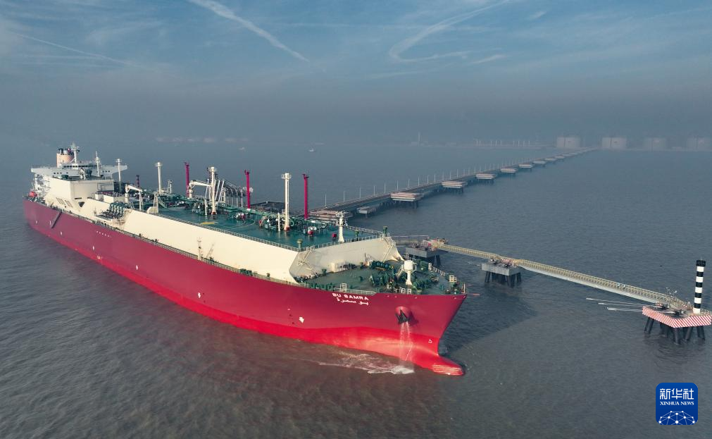 2023年12月26日、唐山港・曹妃甸港区の液化天然ガス(LNG)埠頭で荷降ろしするLNG船。(小型無人機から、唐山=新華社記者/楊世尭)
