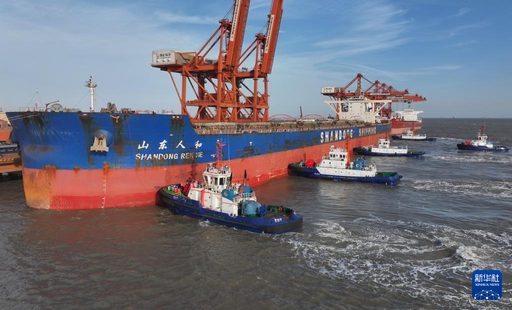 2023年12月26日、荷降ろしを終え、唐山港・曹妃甸港区の鉱石埠頭を離れる船舶。(小型無人機から、唐山=新華社記者/楊世尭)