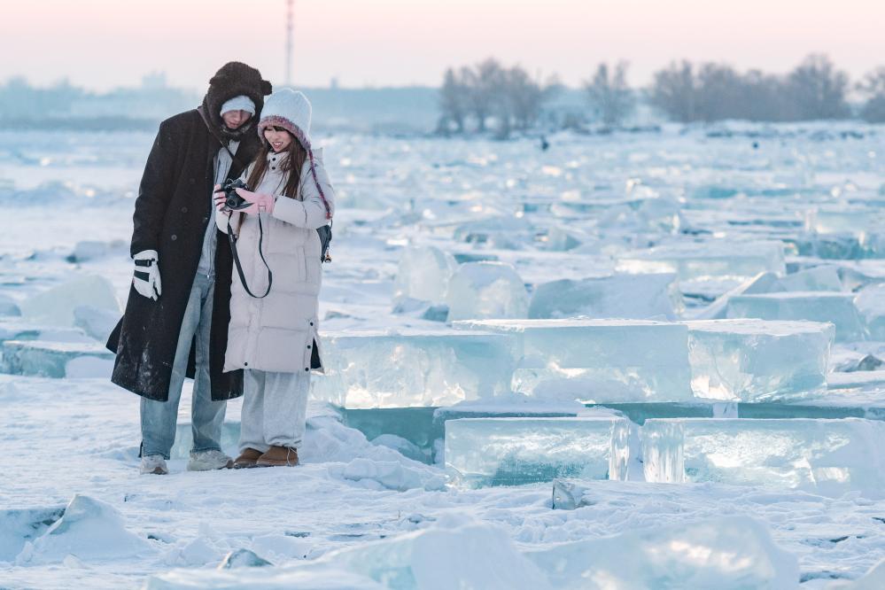 7日、ハルビン市内を流れる松花江の畔で、純度の高い氷塊が数多く放置されている採氷場で記念撮影する観光客。(ハルビン=新華社記者/謝剣飛)