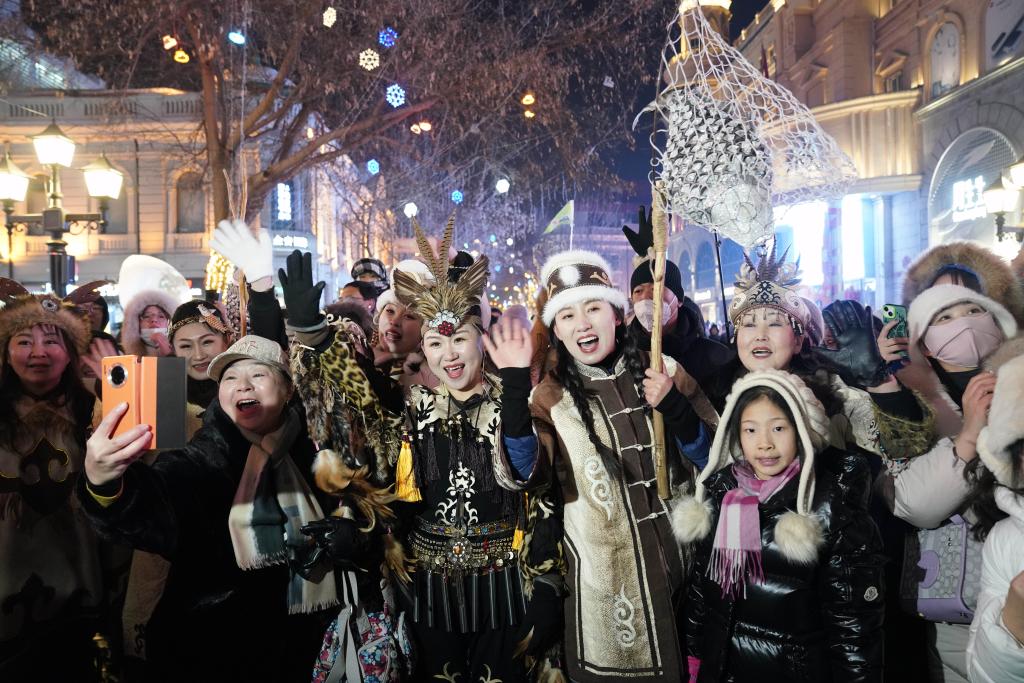 6日、黒竜江省ハルビン市の中央大街で、民族衣装を着て観光客にあいさつするホーチョ族の人々と饒河県の文化・観光プロモーション担当者。(ハルビン=新華社記者/王建威)