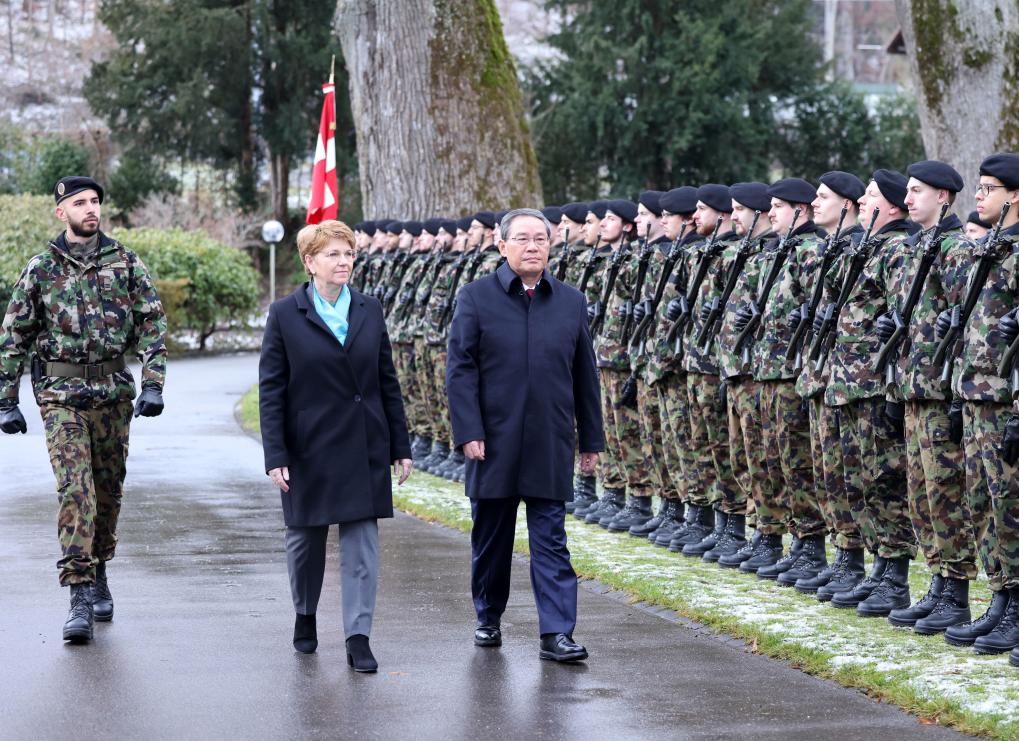 中国の李強(り・きょう)国務院総理は現地時間15日午前、スイスのベルンで同国のアムヘルト大統領と会談した。写真は会談に先立ち、アムヘルト大統領と儀仗隊を観閲する李強総理。(ベルン=新華社記者/王曄)