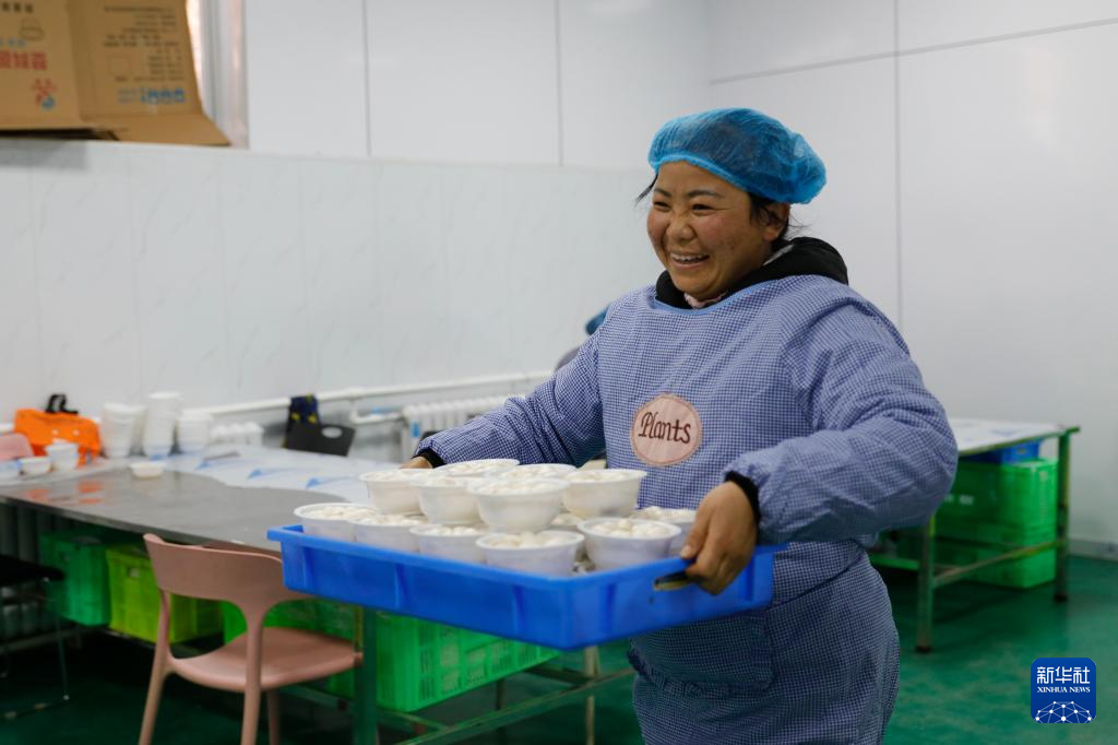16日、渭源県田家河郷の企業、甘粛鑫禾億農業科技で、仕分け後のユリ根を運ぶ従業員。(渭源=新華社記者/方欣)
