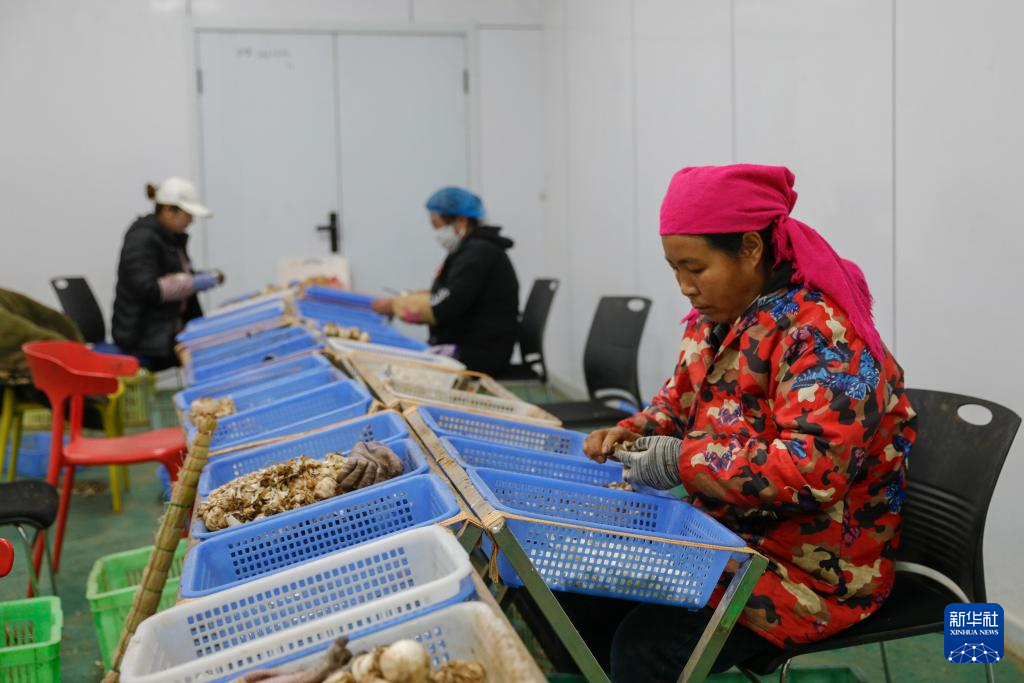 16日、渭源県田家河郷の企業、甘粛鑫禾億農業科技でユリ根を仕分ける従業員。(渭源=新華社記者/方欣)
