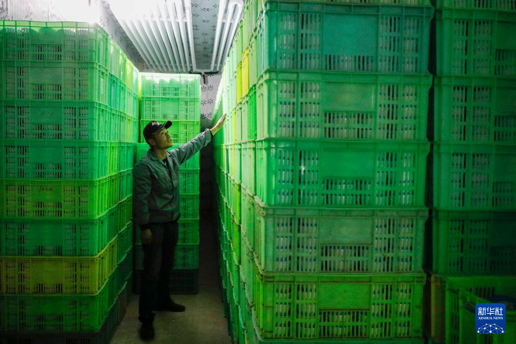 16日、渭源県田家河郷の企業、甘粛鑫禾億農業科技の冷蔵倉庫内で在庫を数える従業員。(渭源=新華社記者/張智敏)
