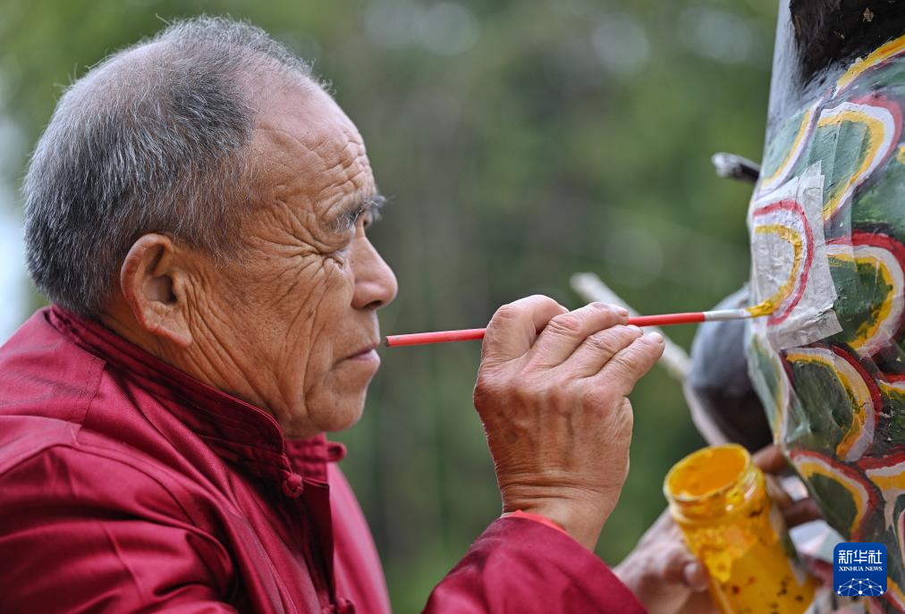1日、彩竜に色付けする羅徳書さん。(成都=新華社記者/劉坤)