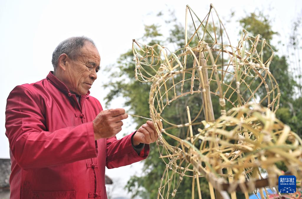 1日、彩竜の枠を組む羅徳書さん。(成都=新華社記者/劉坤)pagebreak