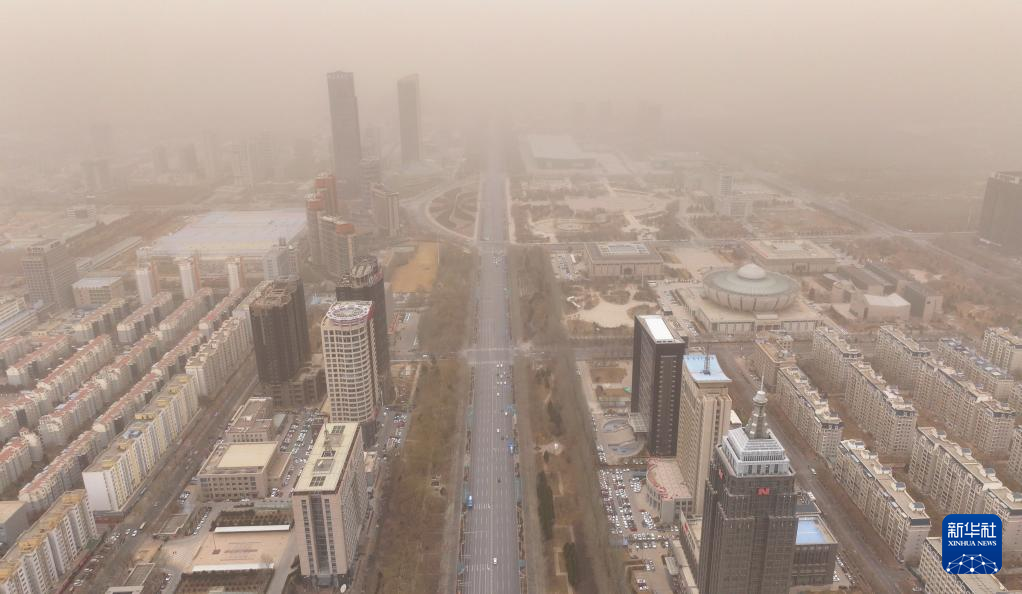 18日、砂嵐に見舞われた銀川市の北京路。(小型無人機から、銀川=新華社記者/馮開華)