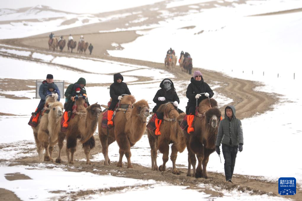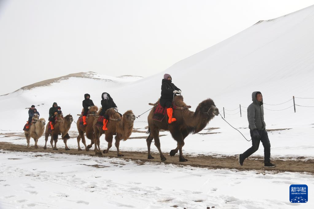 19日、敦煌市の鳴沙山・月牙泉風景区をラクダで遊覧する観光客。(敦煌=新華社配信/張暁亮)