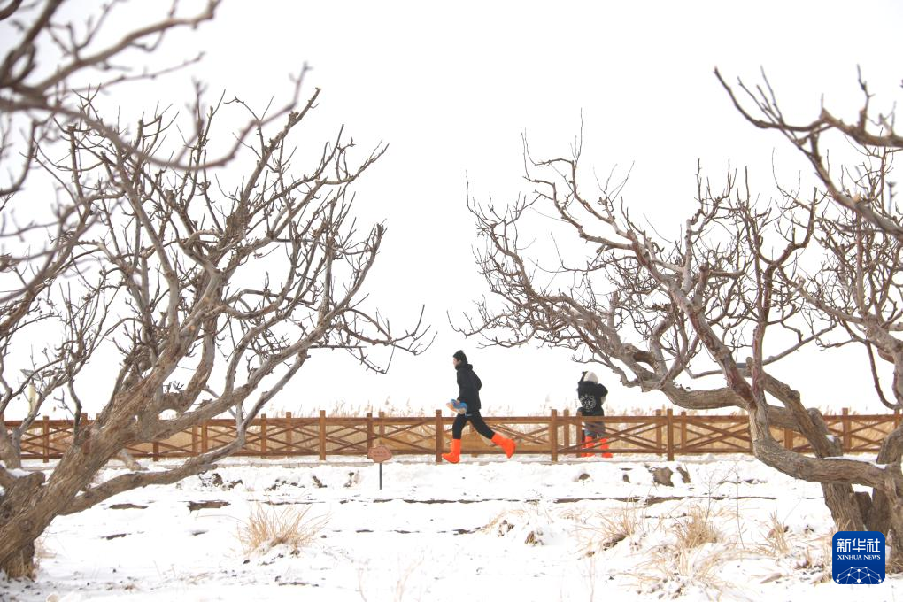 19日、敦煌市の鳴沙山・月牙泉風景区を散策する観光客。(敦煌=新華社配信/張暁亮)