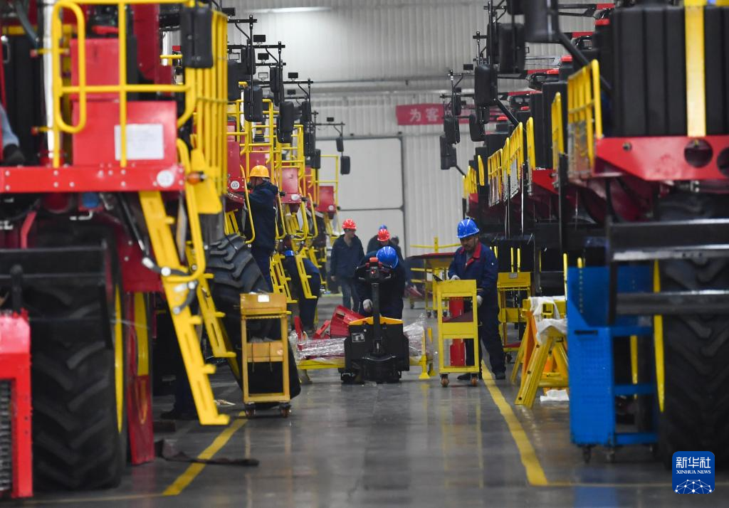 2月28日、新疆鉢施然智能農機の工場で綿摘み機を組み立てる従業員。(ウス=新華社記者/趙戈)