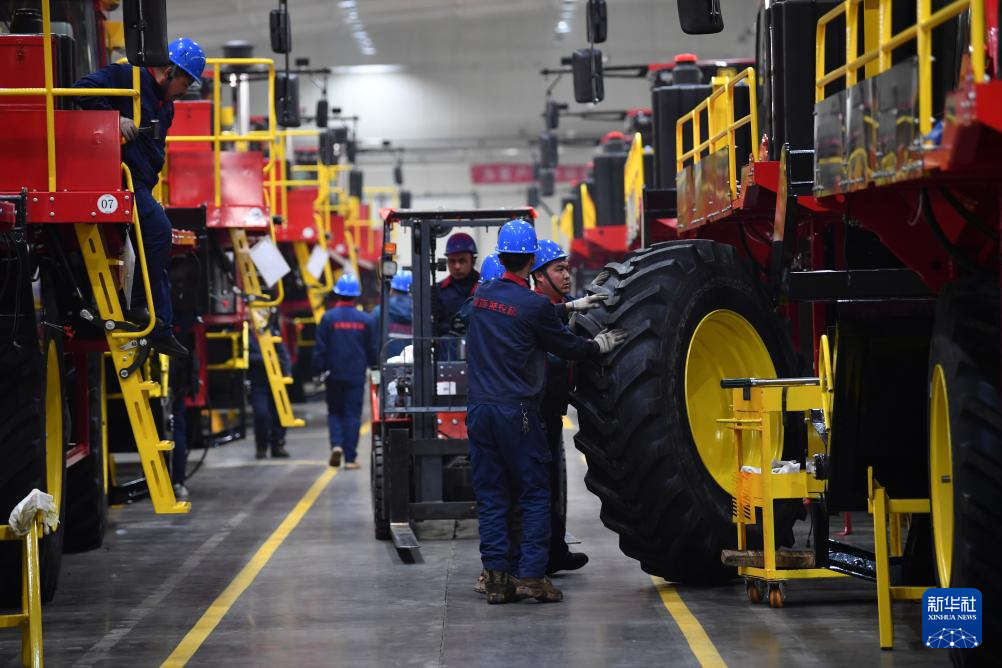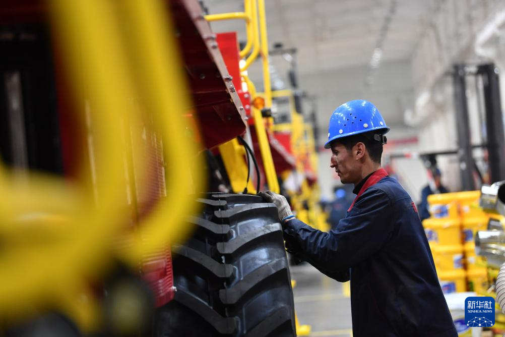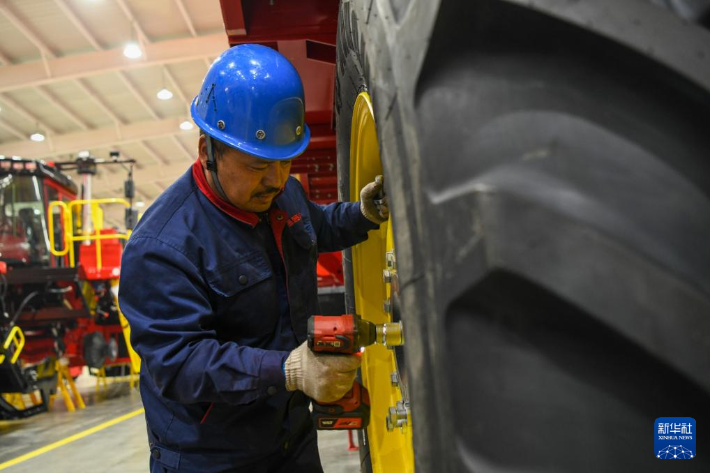 2月28日、新疆鉢施然智能農機の工場で綿摘み機にタイヤを装着する従業員。(ウス=新華社記者/趙戈)