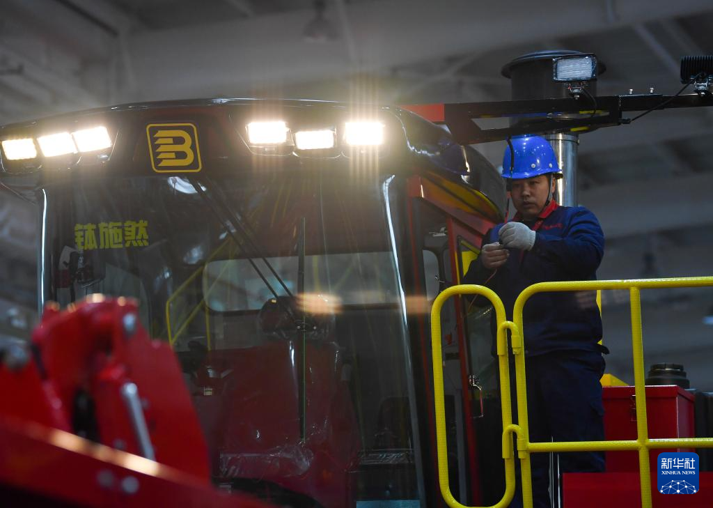 2月28日、新疆鉢施然智能農機の工場で綿摘み機を点検する従業員。(ウス=新華社記者/趙戈)