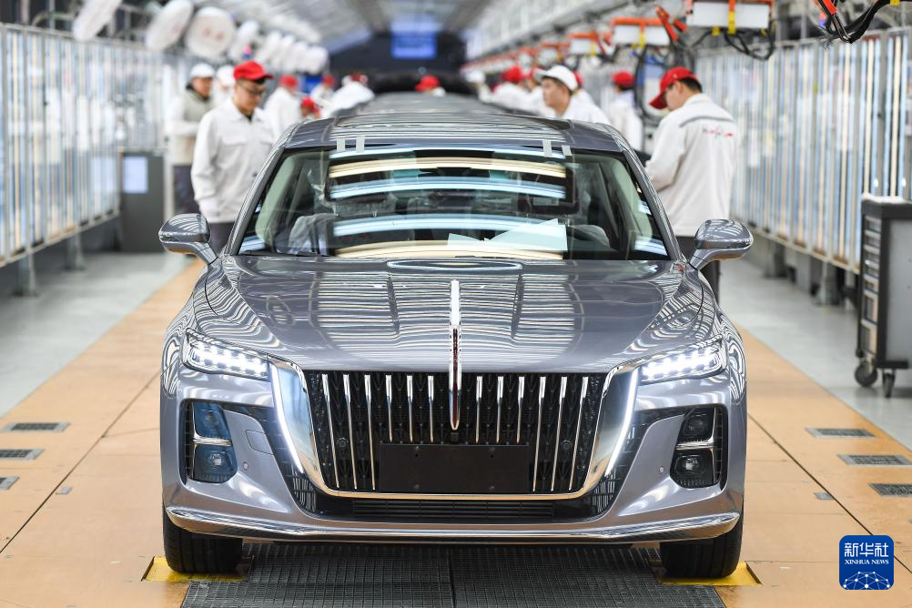 吉林省長春市の一汽紅旗繁栄工場の組立ラインで、車両を検査する従業員。(2月19日撮影、長春=新華社記者/張楠)