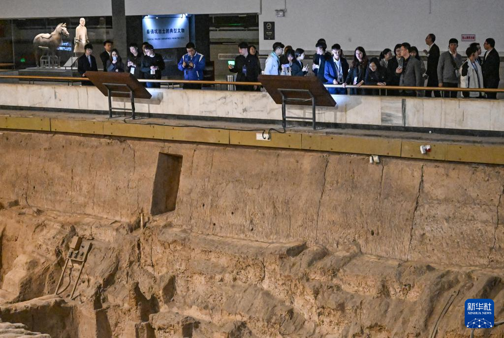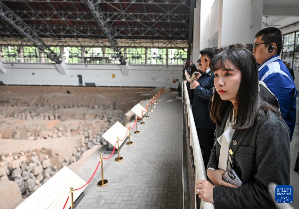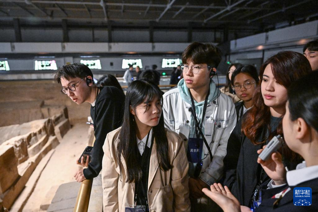 6日、秦兵馬俑2号坑遺跡を見学する台湾青年ら。(西安=新華社記者/陳曄華)