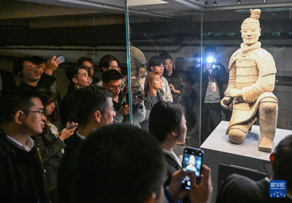 6日、秦兵馬俑2号坑遺跡に展示されている跪射俑(きしゃよう)を見学する台湾青年ら。(西安=新華社記者/陳曄華)