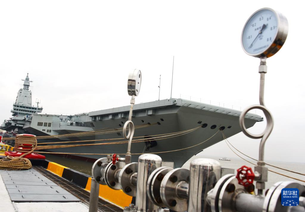 4月30日、ふ頭に停泊する出発前の空母「福建」。(上海=新華社配信/蒲海洋)