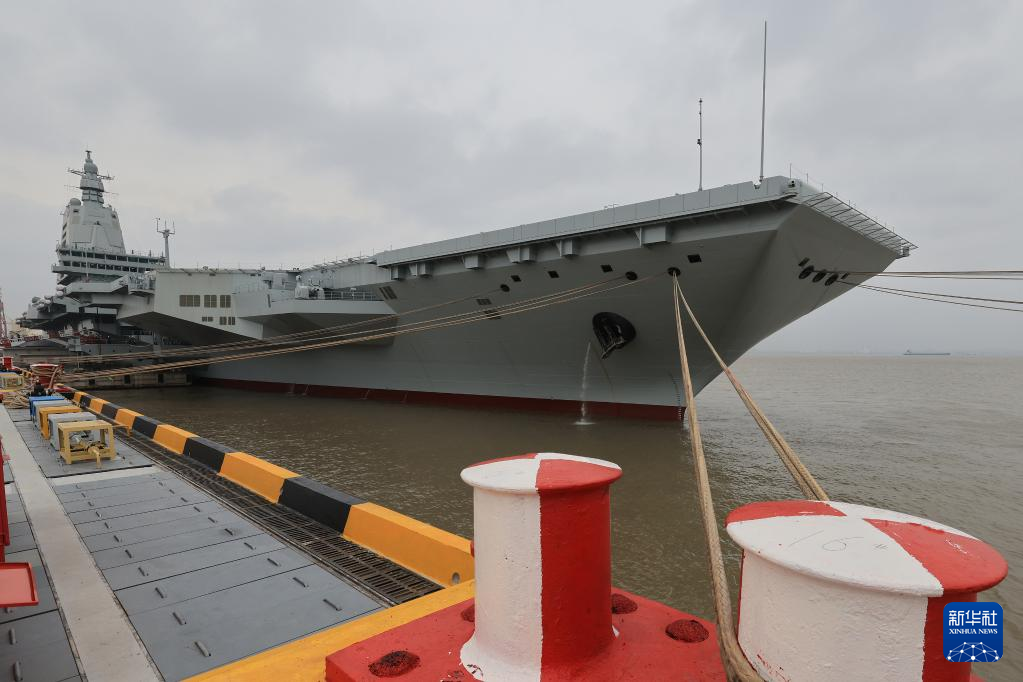 4月30日、ふ頭に停泊する出発前の空母「福建」。(上海=新華社記者/黎雲)