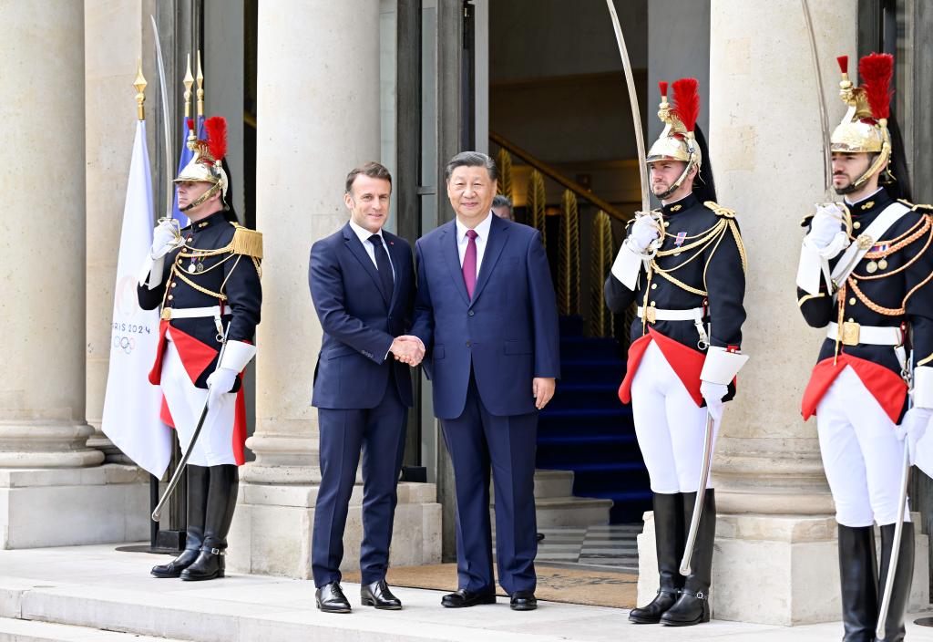 中国の習近平(しゅう・きんぺい)国家主席は6日午前、招きに応じフランス・パリのエリゼ宮で、フランスのマクロン大統領、欧州連合(EU)のフォンデアライエン欧州委員長と中国・フランス・EU首脳会合を行った。写真はマクロン氏と握手を交わす習近平氏。(パリ=新華社記者/李学仁)
