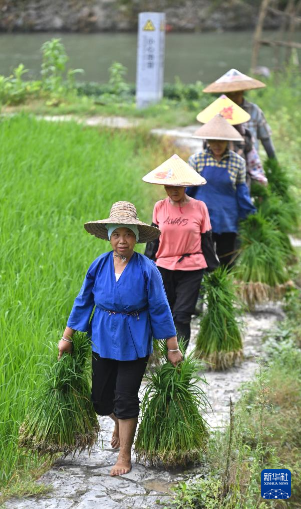 7日、稲の苗を運ぶ平岩村の村民。(柳州=新華社記者/黄孝邦)