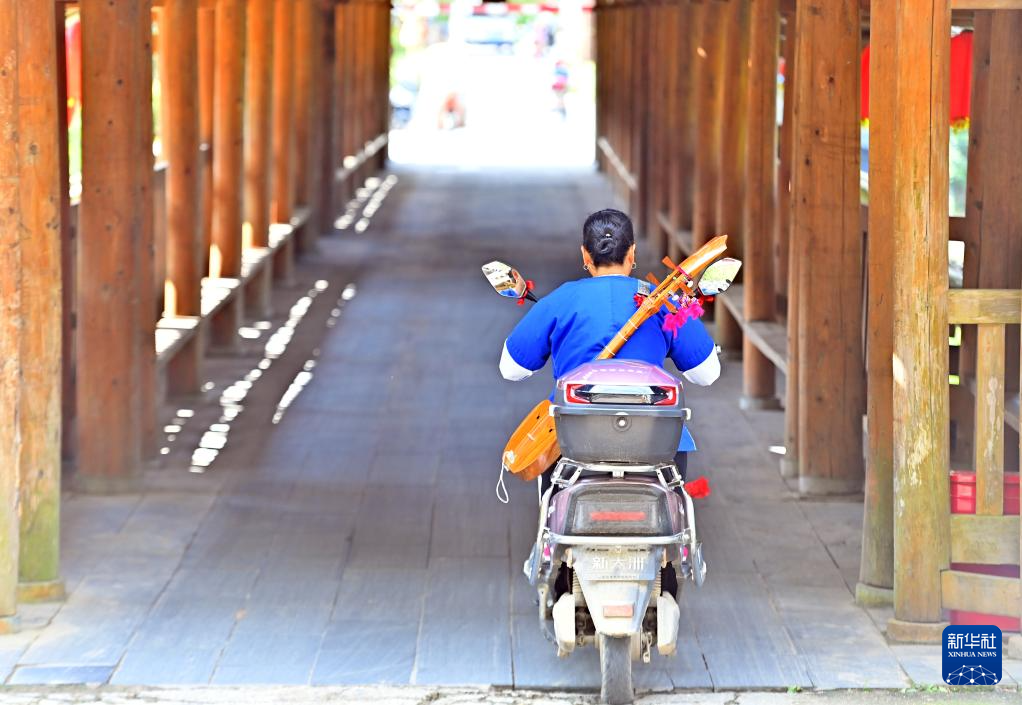 7日、伝統楽器のトン族琵琶を背負い出勤する平岩村の村民。(柳州=新華社記者/黄孝邦)