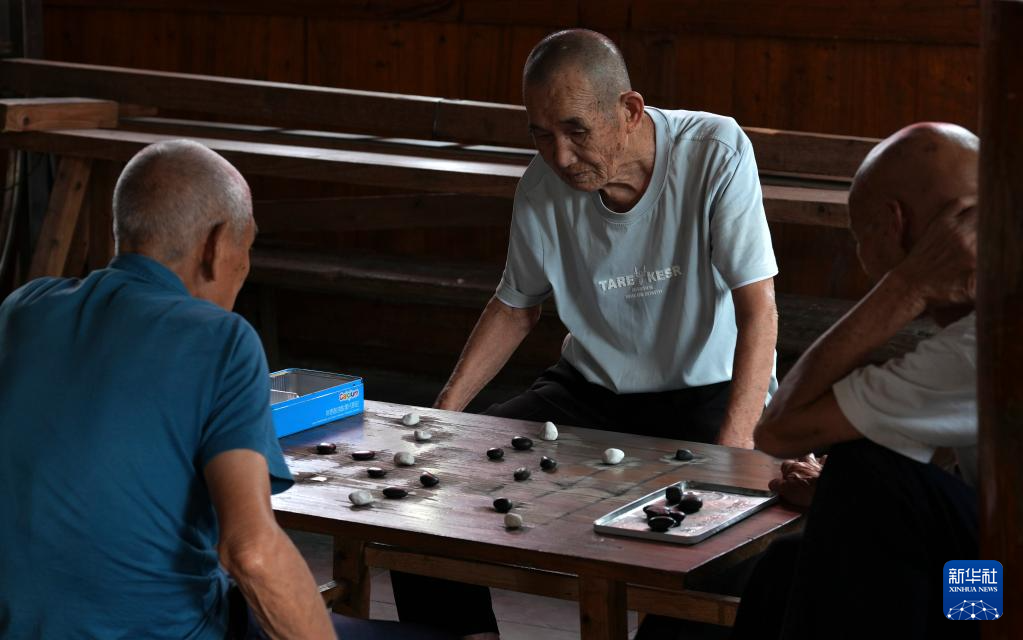 9日、平岩村の鼓楼で碁を打つ高齢者。(柳州=新華社配信/呉練勲)
