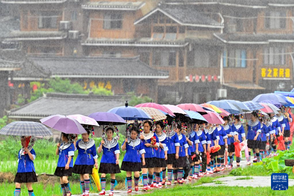 伝統衣装姿で程陽永済橋の落成100周年を祝う平岩村の人々。(6月18日撮影、柳州=新華社記者/黄孝邦)