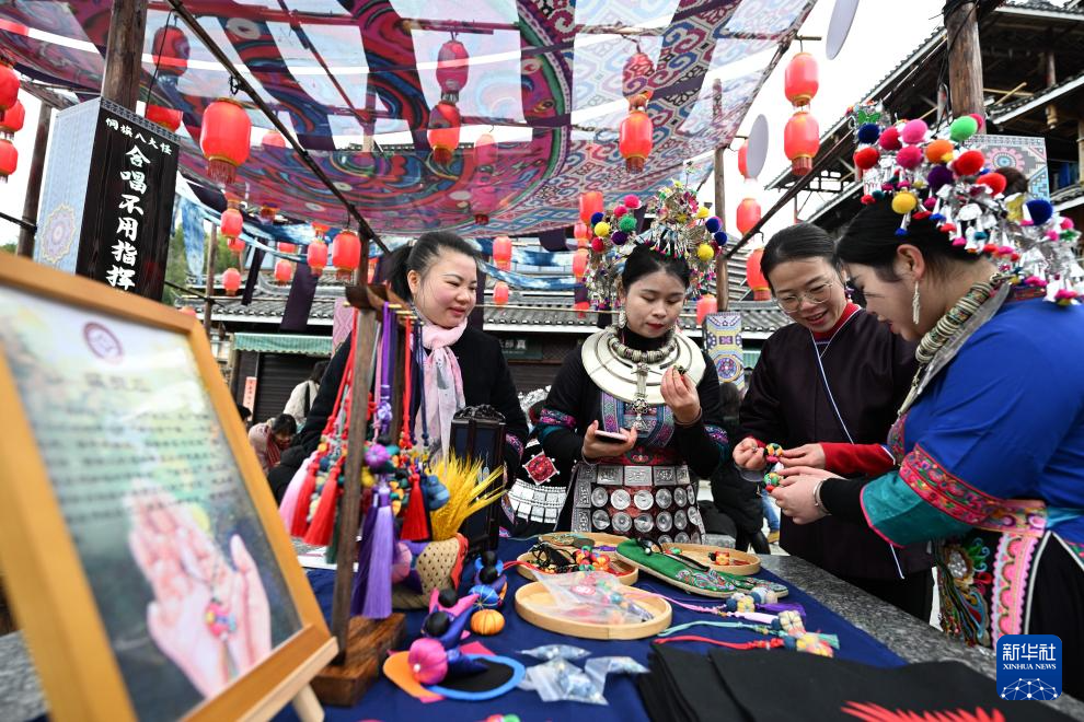 平岩村でトン族の工芸品を選ぶ観光客。(2月3日撮影、柳州=新華社記者/黄孝邦)