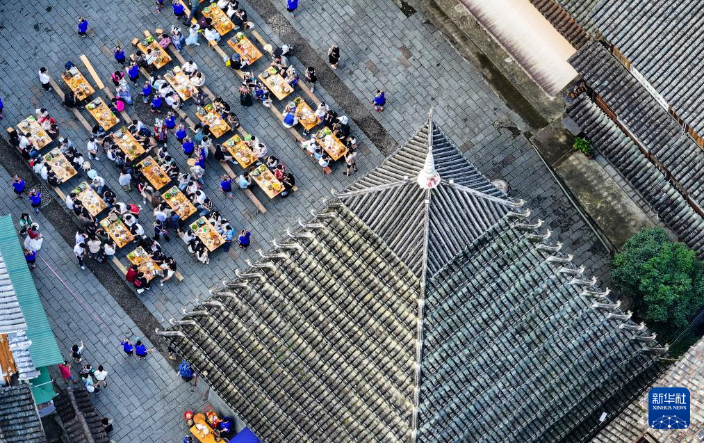 6日、平岩村の程陽永済橋で、百家宴を楽しむ観光客。(ドローンから、柳州=新華社記者/黄孝邦)