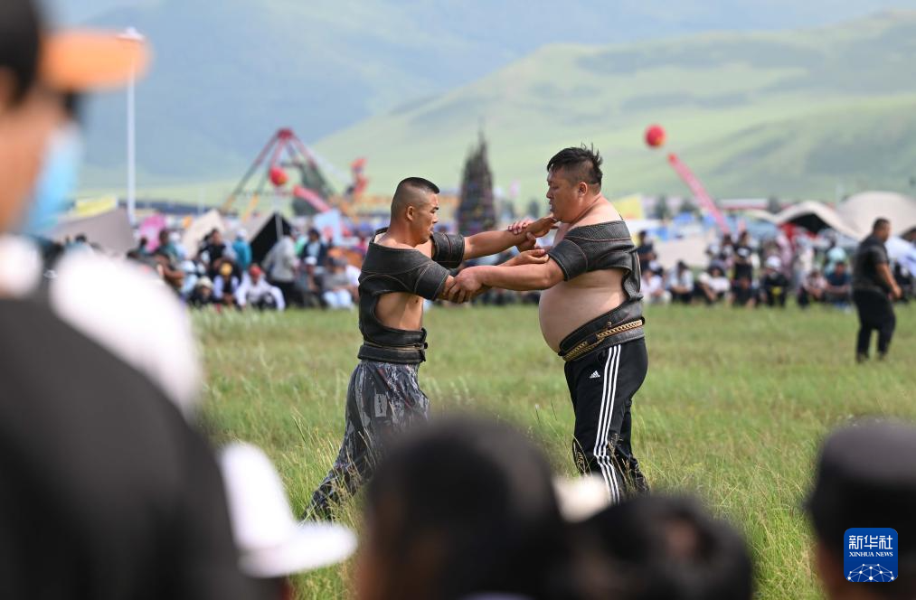 17日、烏蘭毛都蘇木の民族スポーツ総合訓練拠点で行われた伝統的格闘技「ブフ」の試合。(ヒンガン盟=新華社記者/貝赫)