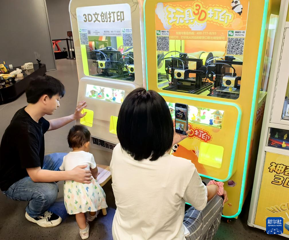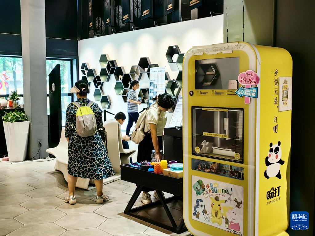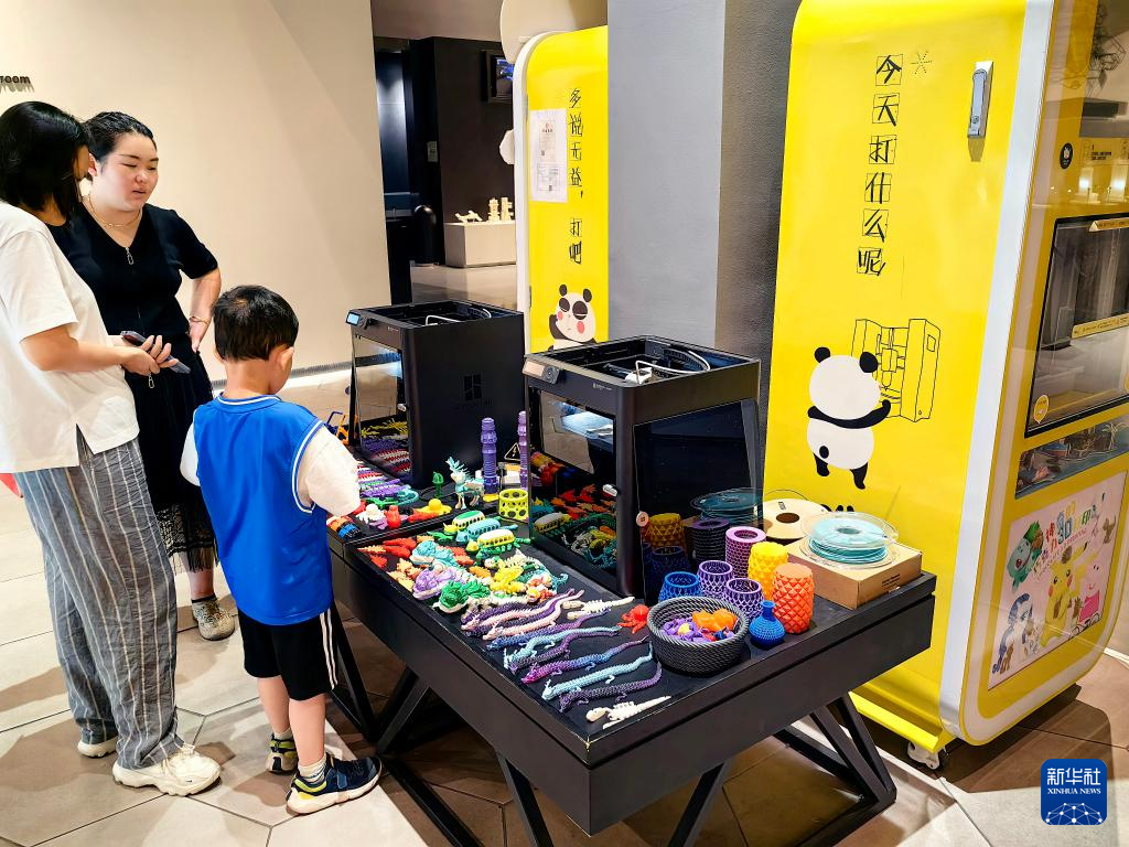 中国3Dプリント文化博物館の体験用3Dプリンターでおもちゃを作る人たち。(7月21日撮影、上海=新華社記者/呉寒氷)