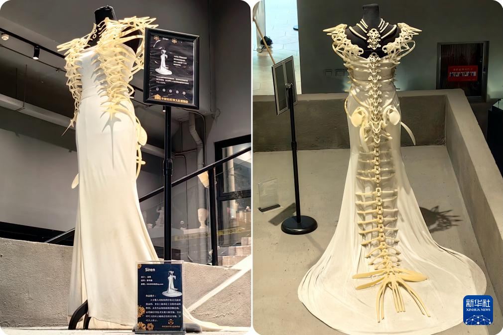 中国3Dプリント文化博物館で展示されている3Dプリントによるドレス。(7月21日撮影、組み合わせ写真、上海=新華社記者/呉寒氷)