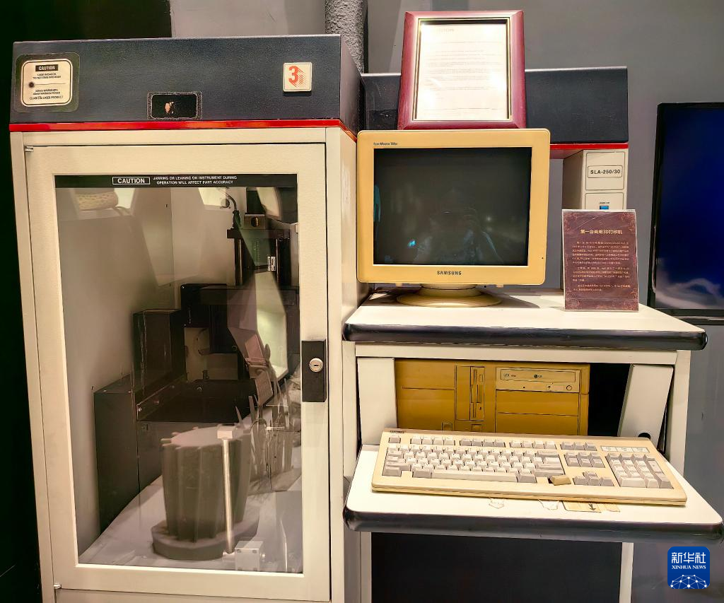 中国3Dプリント文化博物館で展示されている世界初の商用3Dプリンター。(7月21日撮影、上海=新華社記者/呉寒氷)
