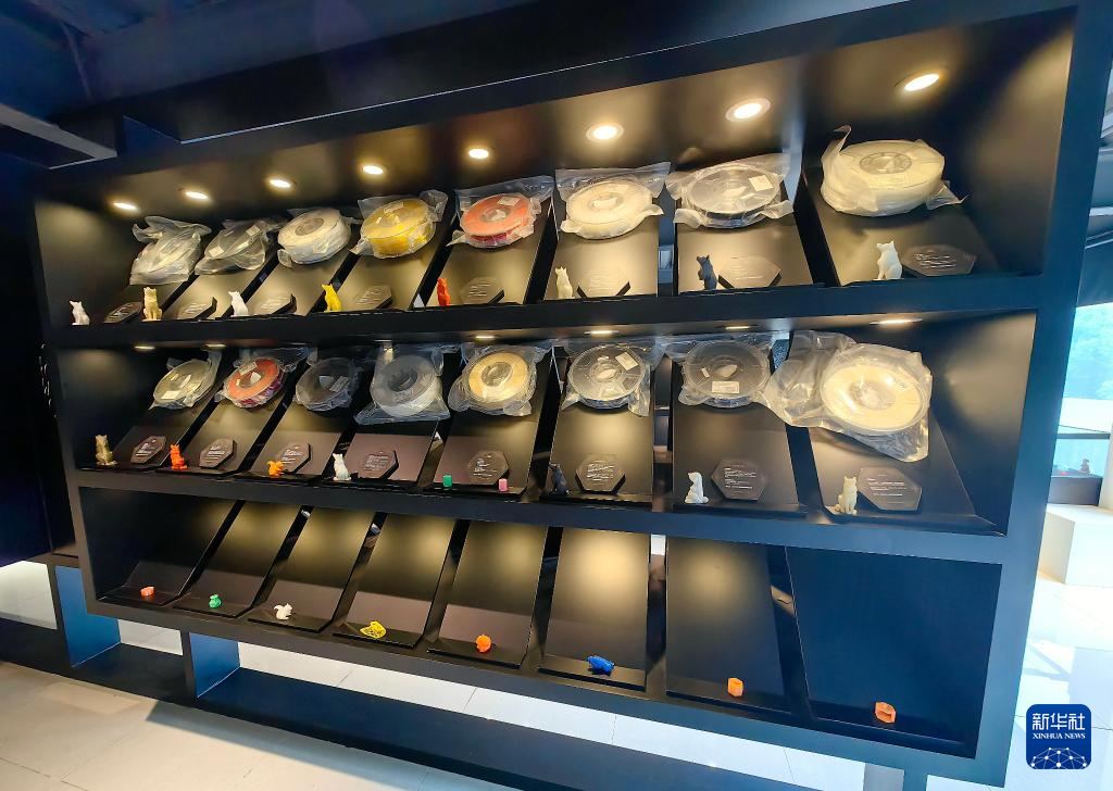 中国3Dプリント文化博物館で展示されている3Dプリントの材料。(7月21日撮影、上海=新華社記者/呉寒氷)