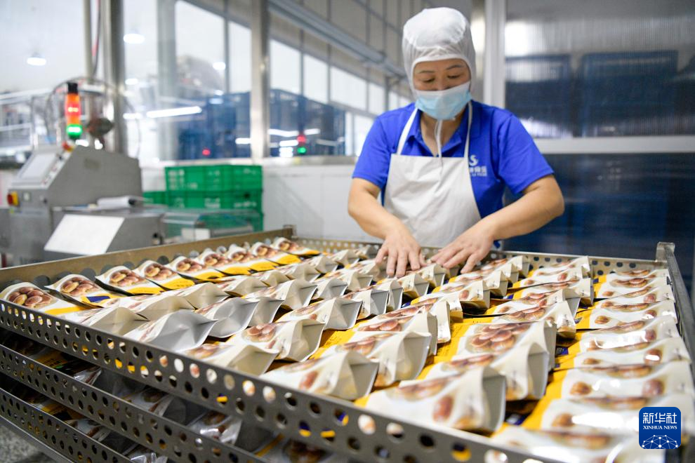 19日、寛城満族自治県の食品メーカー、承徳神栗食品の工場でレトルトパックのむき甘栗を並べる従業員。(承徳=新華社配信/王立群)